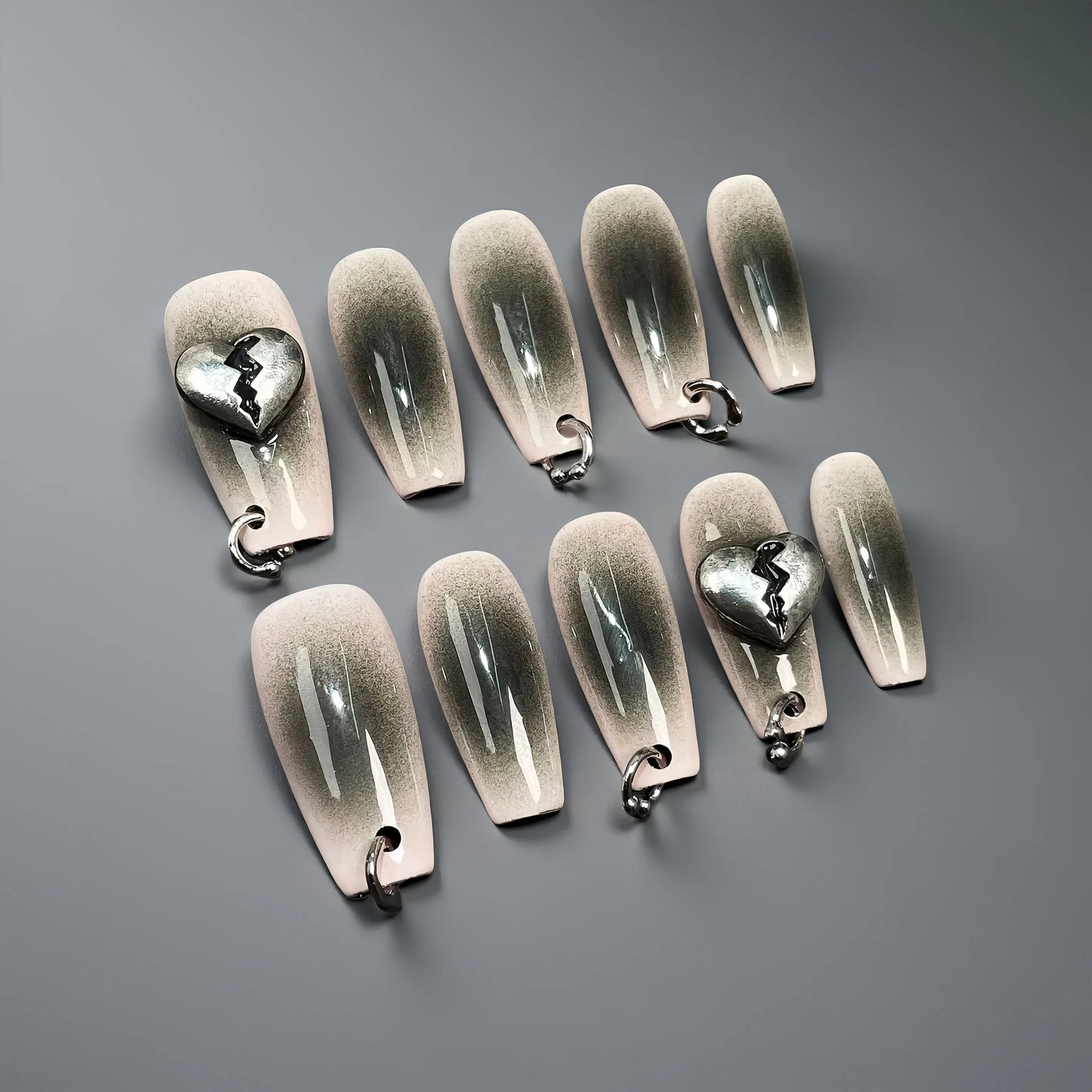 Matte gradient grey with bold silver cracked-heart pendants. For those who wear their stories on their nails — edgy, moody, unforgettable.