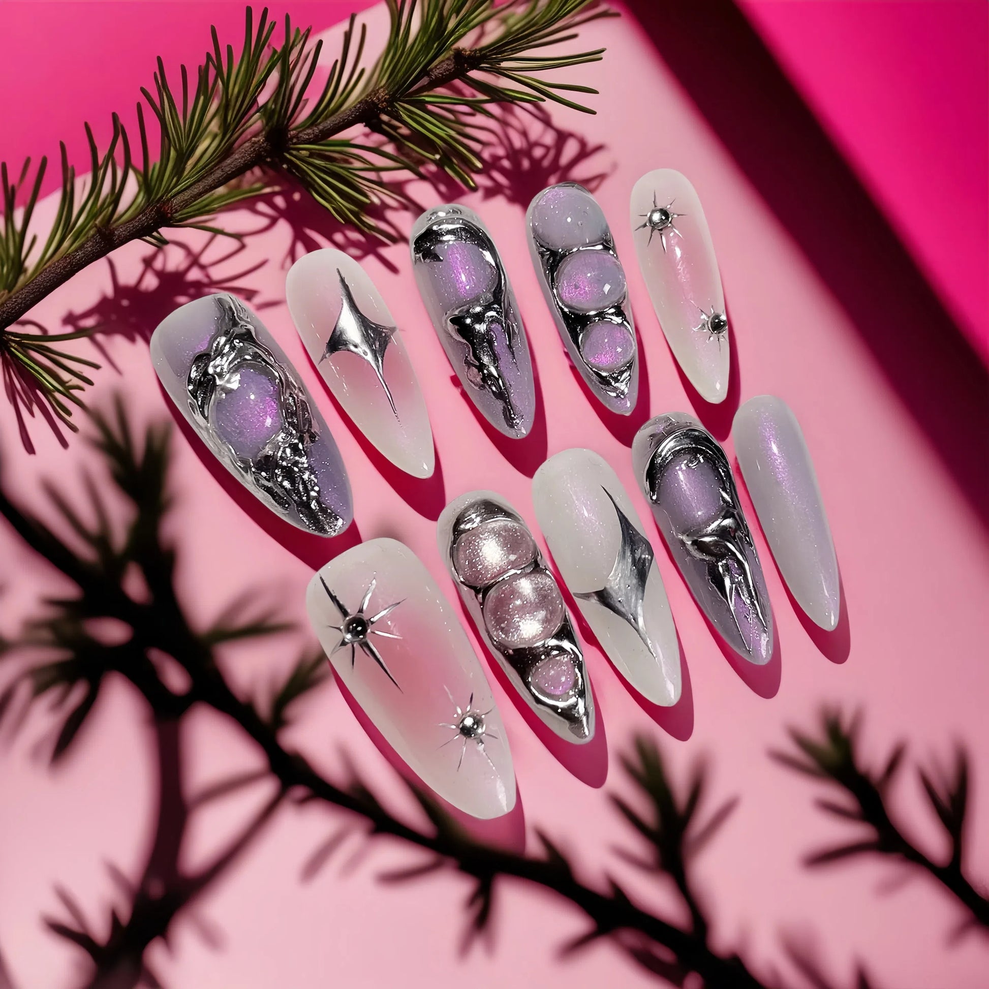 This set features dimensional mirror gels, starlight studs, and glowing pink nebula swirls — a bold look that commands attention.