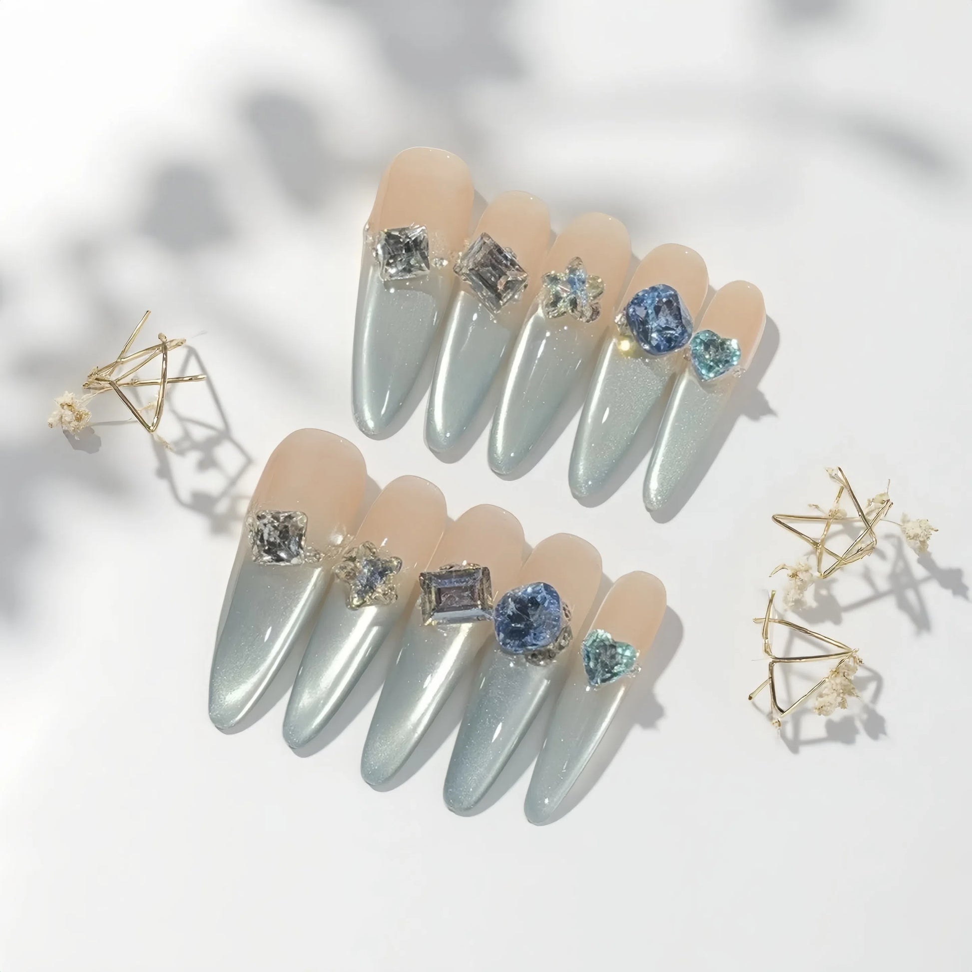 A serene blend of icy blue and nude gradient, topped with sparkling gemstone charms. Inspired by frozen elegance and clarity, this set brings a quiet luxury to your fingertips.