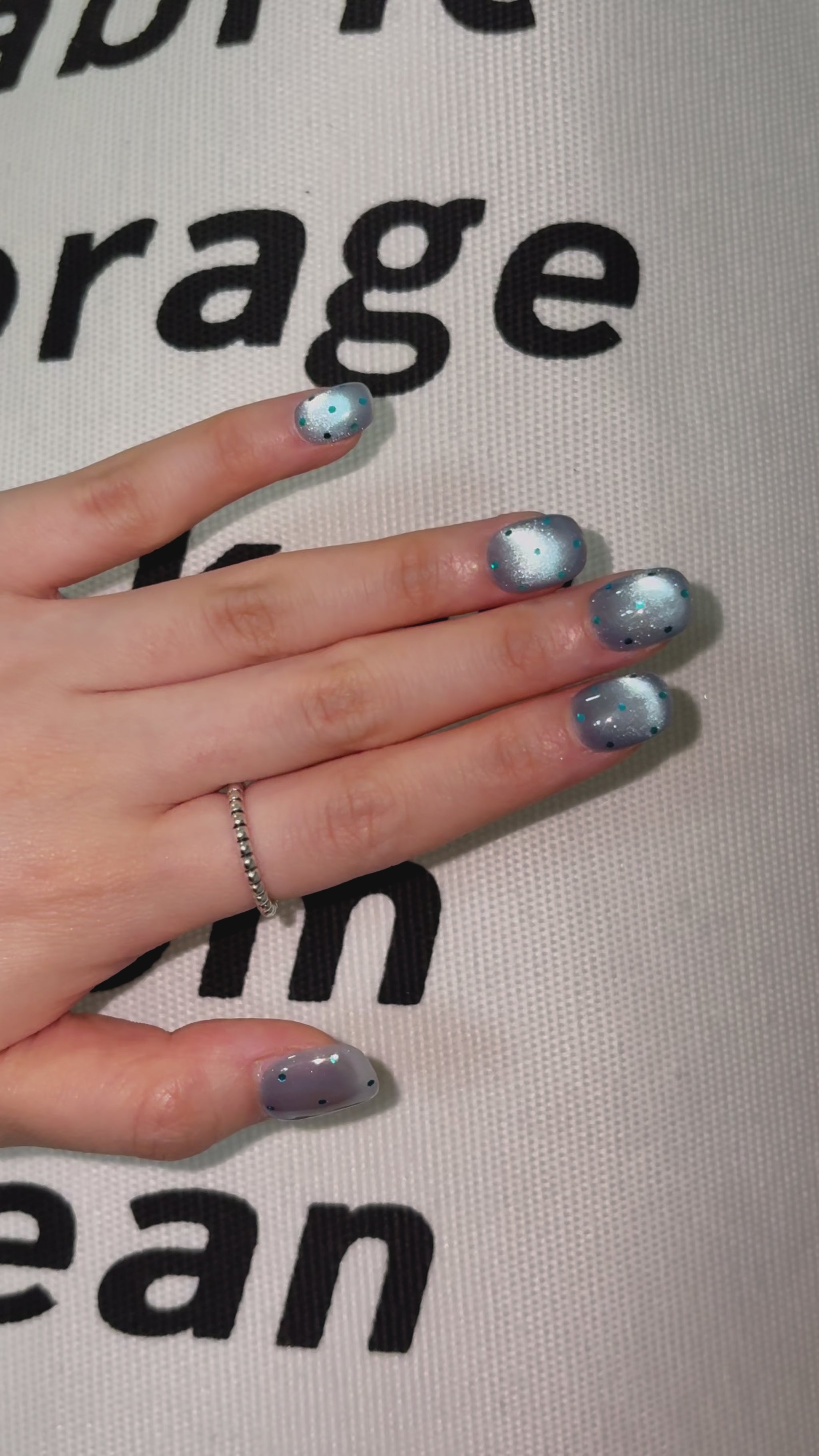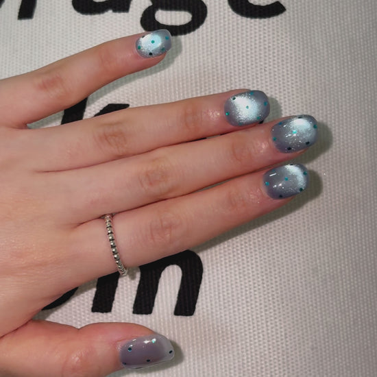 A soft bluish-gray cat-eye with a silky glow—delicate, dreamy, and effortlessly chic like your favorite French treat.